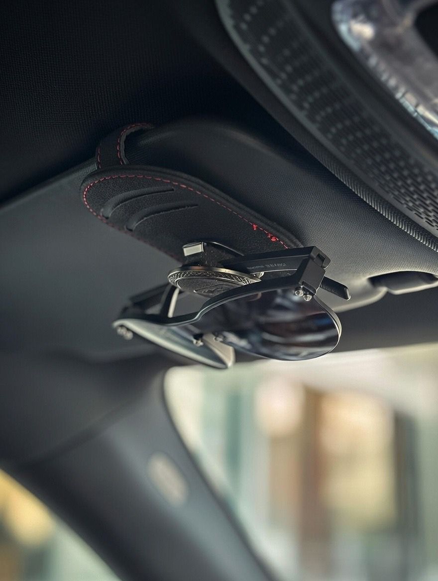 Suport multifuncțional elegant conceput special pentru parasolarul auto, care combină în mod ingenios două funcții esențiale: suport pentru ochelari de soare și card holder pentru carduri de acces, tichete de parcare sau documente importante.